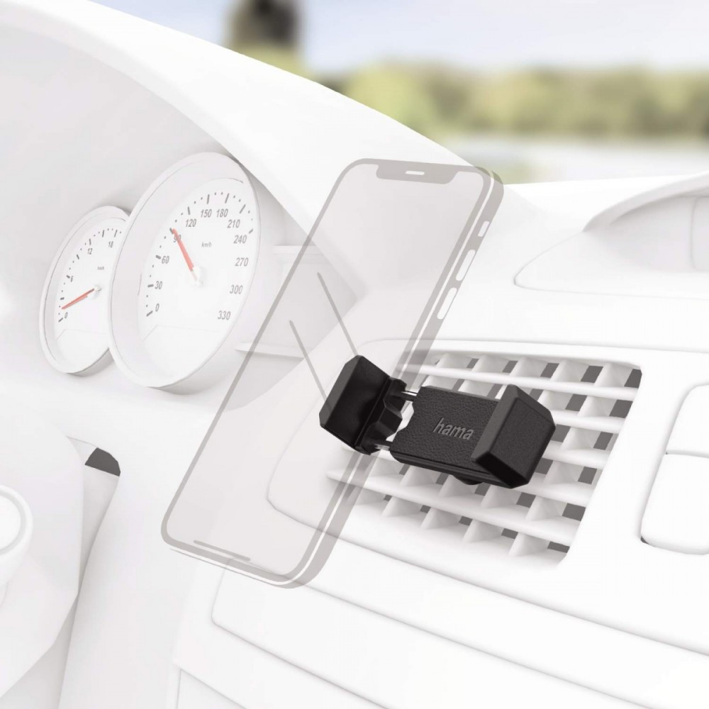 Uchwyt samochodowy umożliwiający zamocowanie telefonu na kratce wentylacyjnej pojazdu. Obracany zacisk pozwala na ustawienie telefonu w pozycji pionowej lub poziomej.